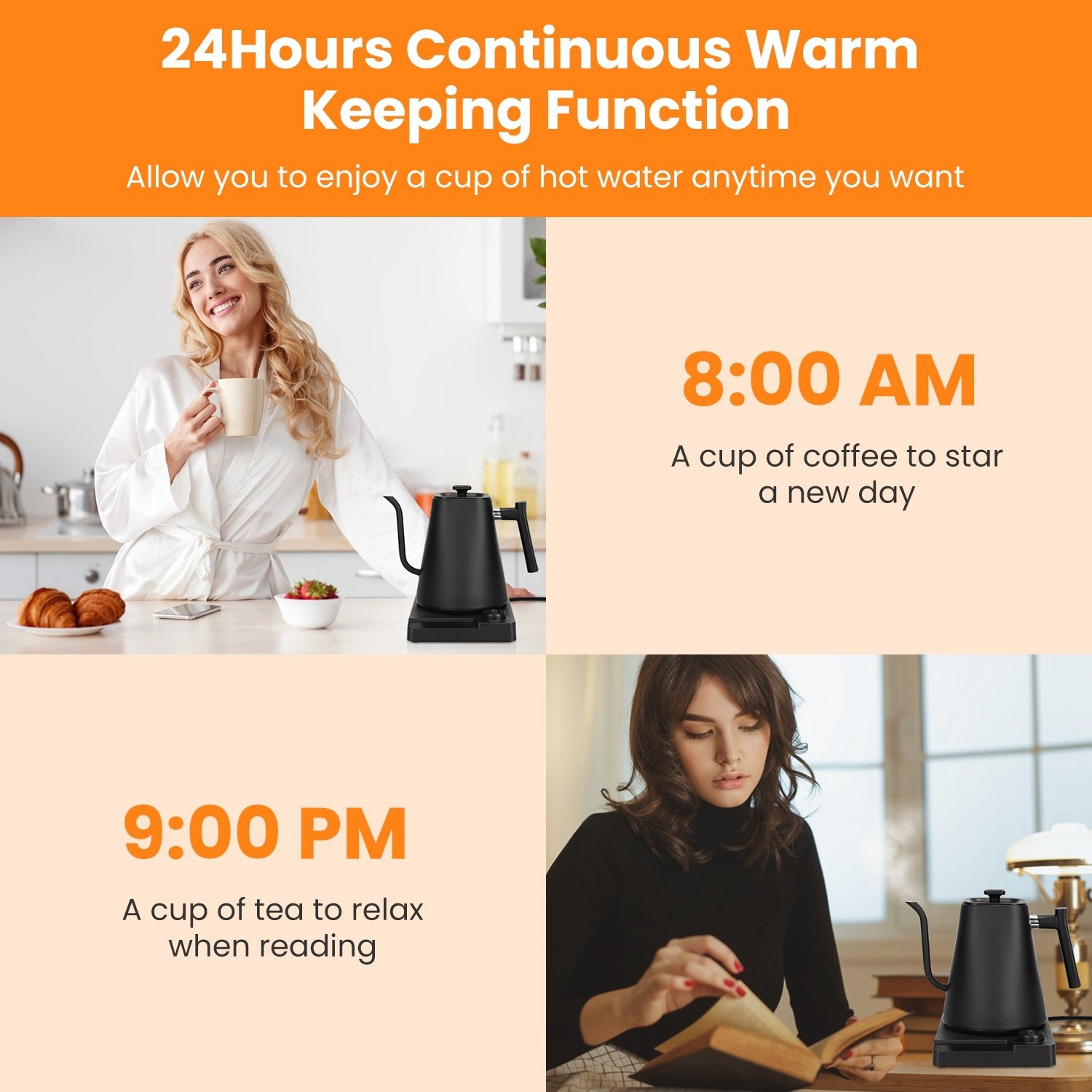 *24Hours Keep Warm*:Long press the on/off button can adjust the built-in timer,this electric tea kettle supports up to 24hours continuous warm keeping(10Min/Graduation). Due to the smart timer function,you are able to enjoy a cup of hot water any time you want,especially in the late night or early morning,no need to wait for even 1 second.