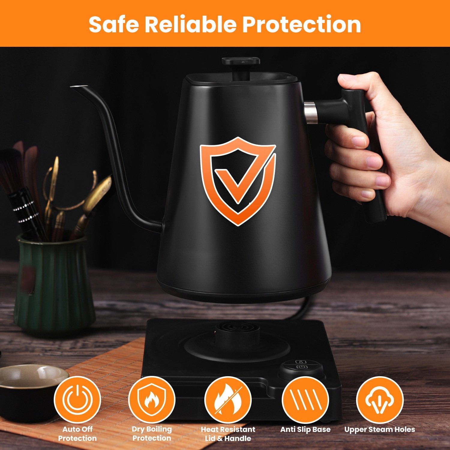 *Safe Material & Protection*:The interior of this gooseneck kettle with temperature adjustment is made of food-graded 304 stainless steel,no harmful substance or metal taste will dissolve out in your tea or coffee,safe for everyone to use. Adopt advanced NTC technology,provides auto-off protection when dry boiling,overheating,over current and over voltage.