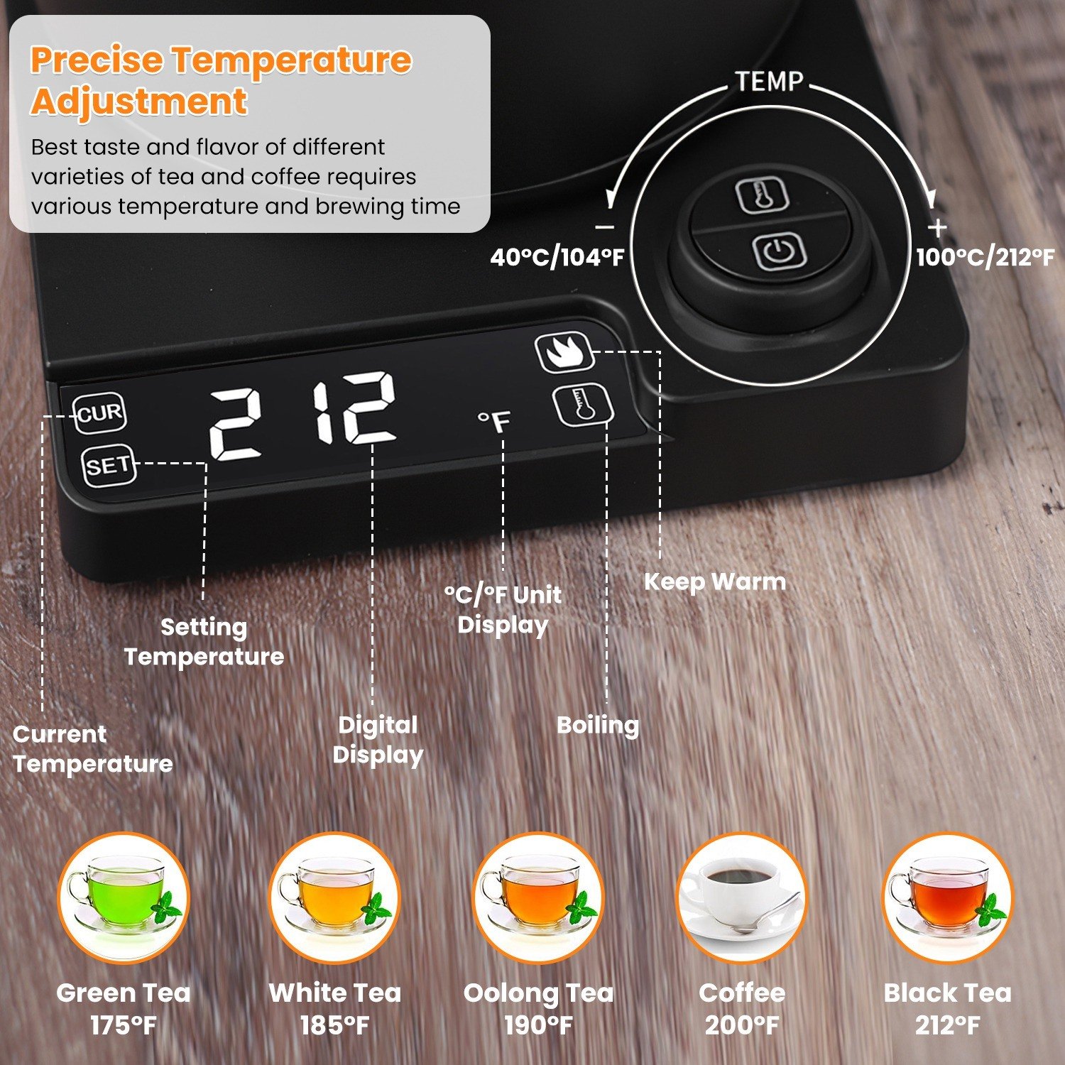 3.Come with accurate temperature adjustment from 104°F to 212°F, you can just slightly rotate the knob and read the current or setting temperature in the digital screen of electric gooseneck kettle.