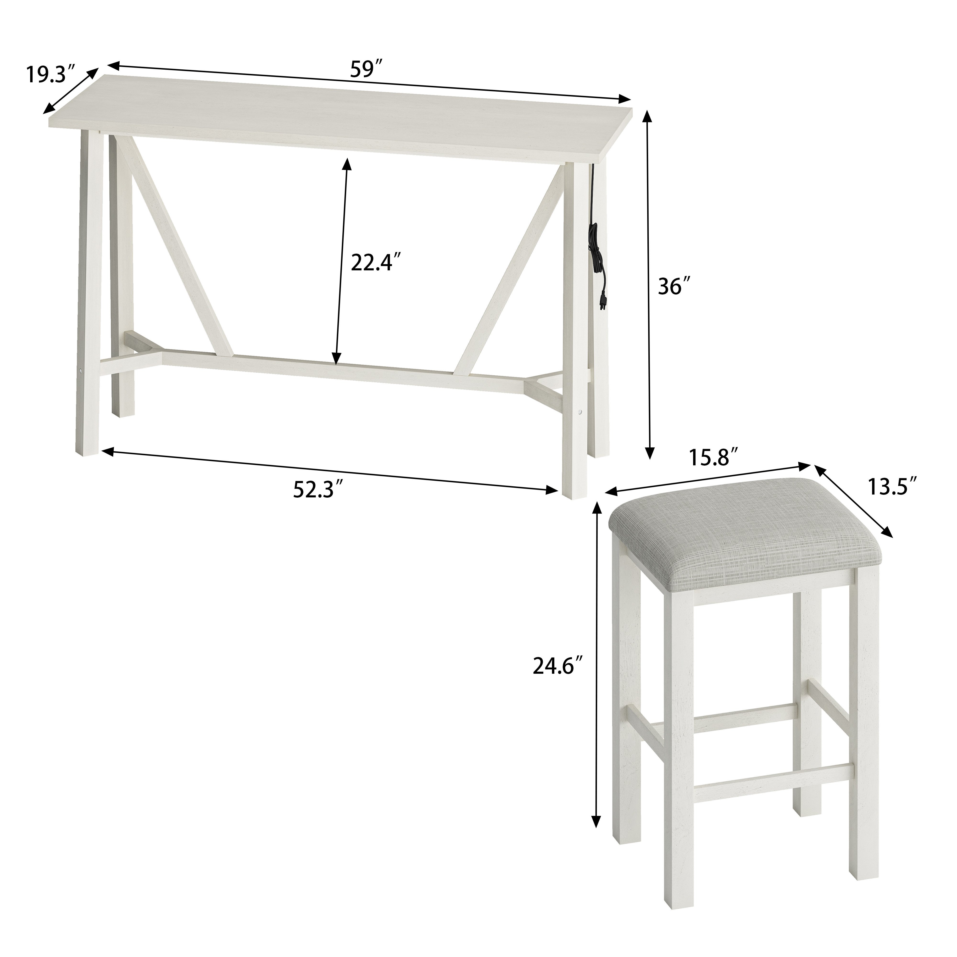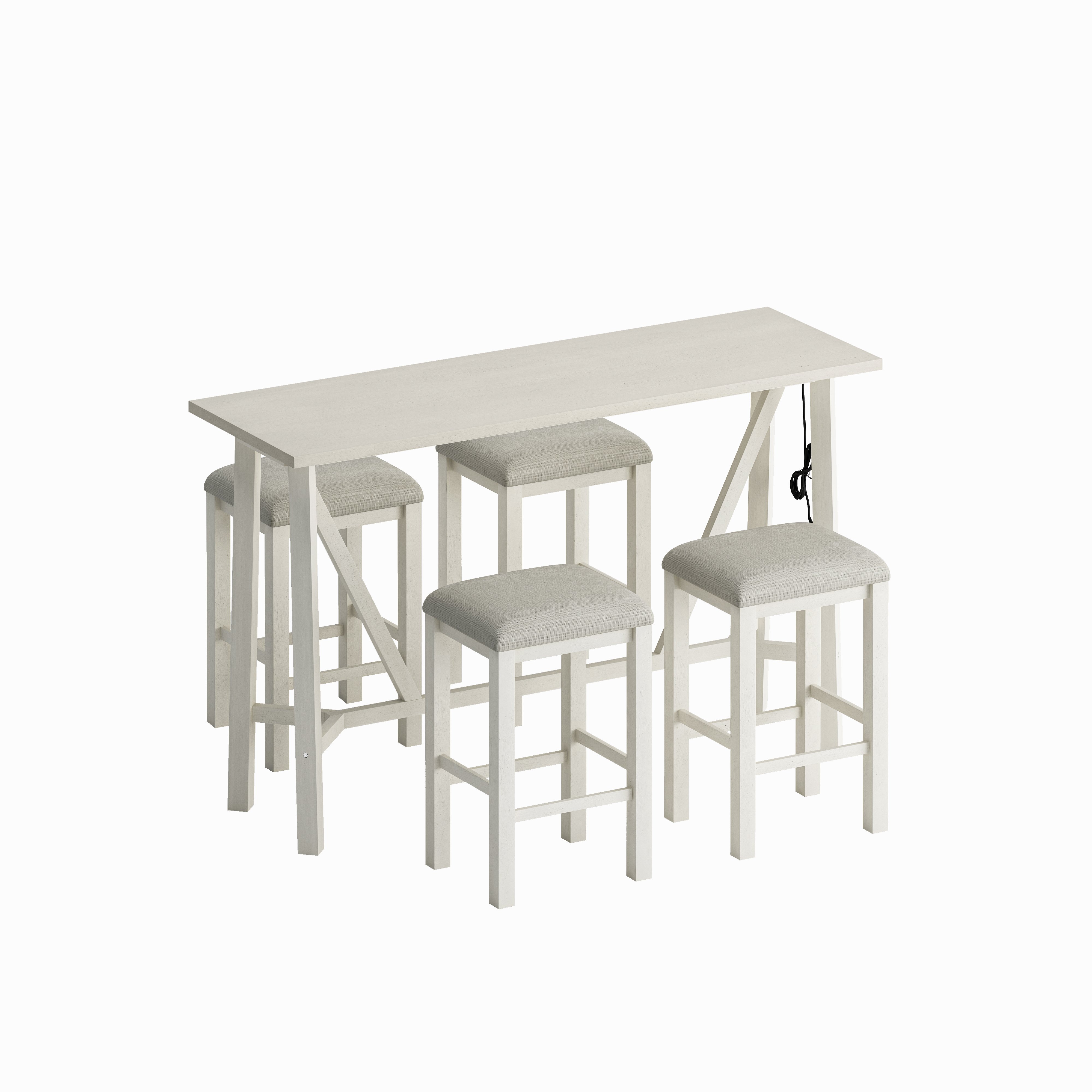 Features:Experience the perfect blend of style, convenience, and durability with this 5-piece dining table set. Add a touch of elegance to your dining area while enjoying the practicality of a built-in power outlet.The combination of the sturdy rubberwood legs and the stylish linen fabric seat cushions creates a captivating visual contrast, adding a touch of sophistication to your home decor.With its sturdy construction and splayed feet design, this dining table set ensures stability and durability for long-lasting use.Whether it's a cozy dinner for two or a small gathering of friends, this dining set is the perfect choice. Don't miss out on this opportunity to enhance your dining experience.Product Weight & Dimensions Specifications:Product Name5-Piece Dining Table Set with Power OutletsColorBeigeMaterialTable: MDF Panel+Rubberwood LegsStool: rubber wood+Linen cover+foamPackage Number1Product Dimensions/WeightTable:59"L x 19.30"W x 36"H, 54.01 lbsStool:15.80"L x 12.60"W x 24.60"H, 11.90 lbs/piecePackage Dimensions62.99"Lx22.83"Wx9.45"HOverall WeightNet Weight: 110.23 lbs Gross Weight: 119.05 lbsWeight CapacityTable:350 lbsStool: 250 lbsAssembly RequiredYesAdditional Tools RequiredAll tools includedNotice1.Real Product's Color may be a little different from the image due to the lighting or monitor's display.2.Manual measurement has been used, there may be some reasonable error.Assembly NoticePlease read assemble manual in advance. Please do not over-tighten nuts, as this may cause distortion or breakage.